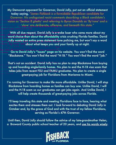 He's running for Governor to restore "Old Florida" for native families and has the background and know how to accomplish it. Fishback aims to fight America Last globalism that displaces Floridians with H-1Bs, illegals, foreign students (~200k from China displacing in-state kids), and private equity like Blackstone outbidding families for homes. He will also tackle rural hollowing (e.g., citrus collapse from greening), donor-driven betrayals (e.g., hate speech laws, $385M Israeli bonds), and the affordability crises. With the funds he will rescue from the current swamp and special interest theft, he will strengthen education, job and housing access, and combat the eroding of morals and ethics in our state and government. His vision: Make Florida for Floridians first—revive citrus/cattle, ban foreign home-buying, divest foreign bonds for family aid, and end imported conflicts to build free, prosperous communities.